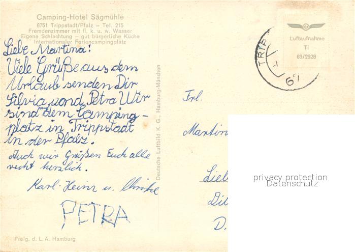 73648285 alte Postkarte Trippstadt Camping Hotel Saegmuehle Fliegeraufnahme postalisch gelaufen Erhaltung siehe scans [WerneD78] KatCode: 11110007335047