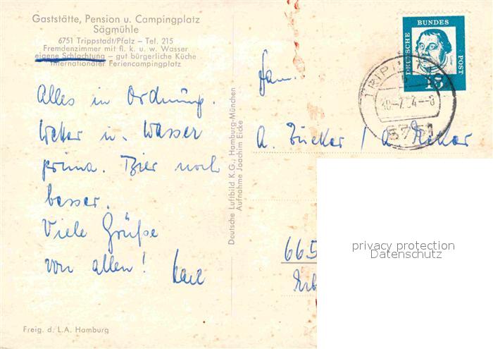 72758884 alte Postkarte Trippstadt Gaststaette Campingplatz Saegmuehle Fliegeraufnahme postalisch gelaufen Erhaltung siehe scans [WerneD78] KatCode: 11110007335047