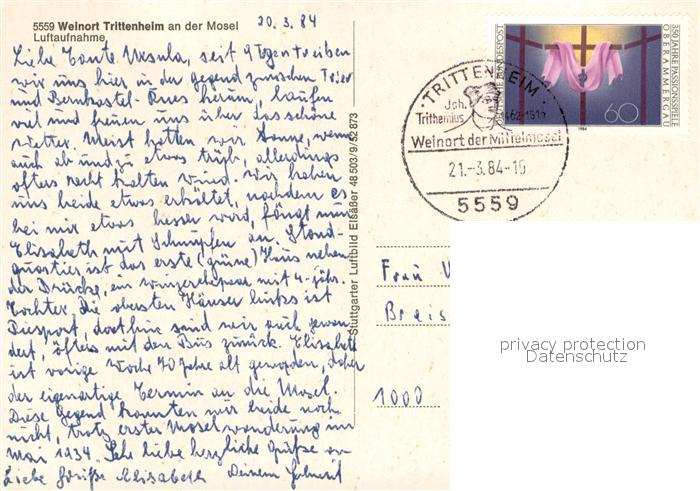 73613165 alte Postkarte Trittenheim Mosel Fliegeraufnahme postalisch gelaufen Erhaltung siehe scans [LiesaD40] KatCode: 11110007231207