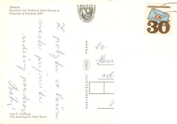 old postcard Trnava Slovakia Sportova hala Druzba Hotel Karpaty Kupalisko Pamatnik SNP postalisch gelaufen Erhaltung siehe scans [FriedD77]