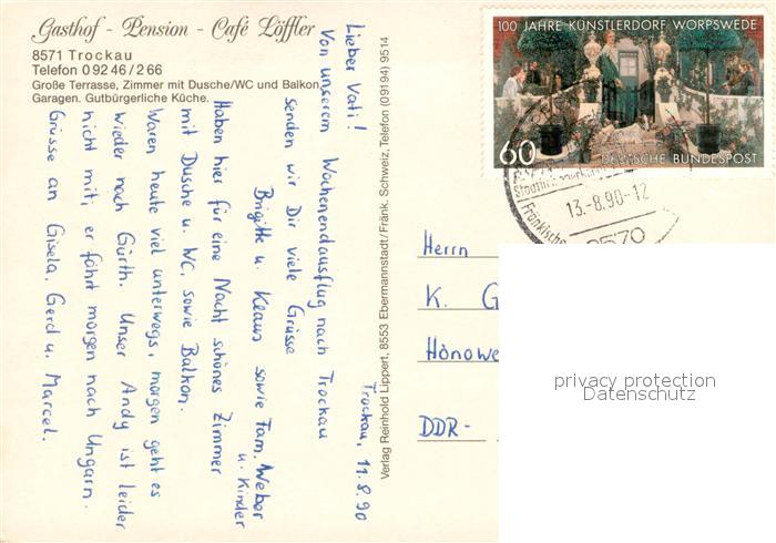 73647966 alte Postkarte Trockau Pegnitz Gasthof Pension Cafe Loeffler Gastraeume Panorama postalisch gelaufen Erhaltung siehe scans [WerneD78] KatCode: 11110009472175