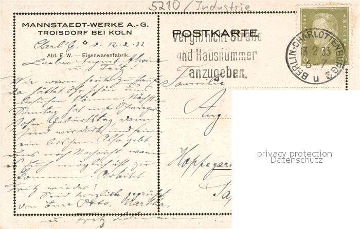 33703491 alte Postkarte Troisdorf Mannstaedt Werke Eisenwaren postalisch gelaufen Erhaltung siehe scans [WerneD78] KatCode: 11110005382068