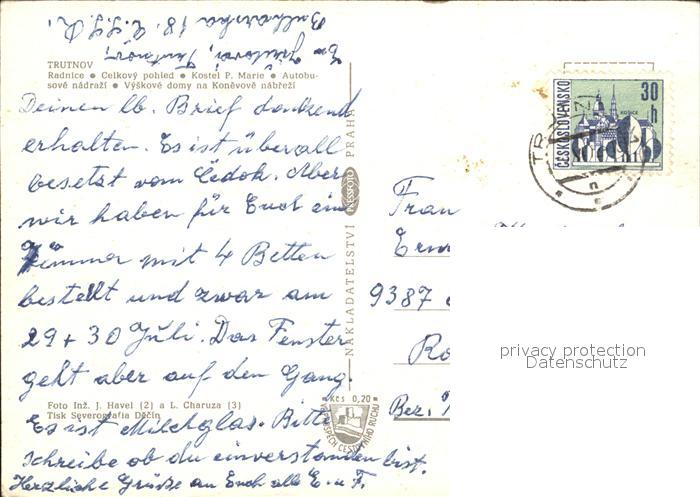old postcard Trutnov Radnice Celkovy pohled Kostel P Marie Autobusove nadrazi Vyskove domy na Konevove nabrezi postalisch gelaufen Erhaltung siehe scans