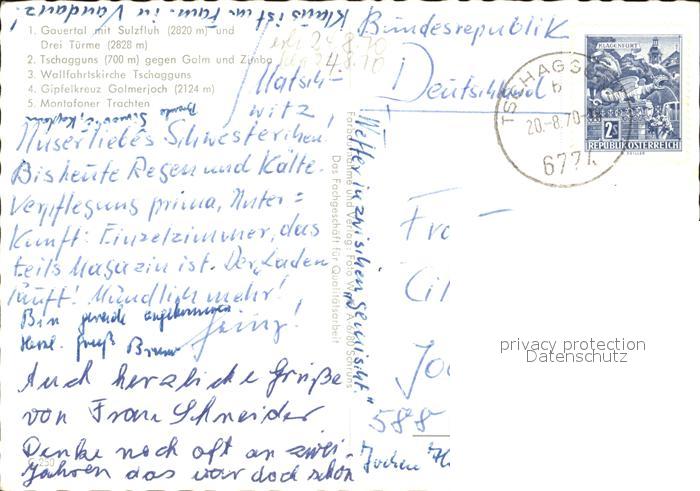 72438194 alte Postkarte Tschagguns Vorarlberg Gauertal Galm und Zimba Wallfahrtskirche Gipfelkreuz Galmerjoch Montafoner Trachten postalisch gelaufen Erhaltung siehe scans KatCode: 11390341080128