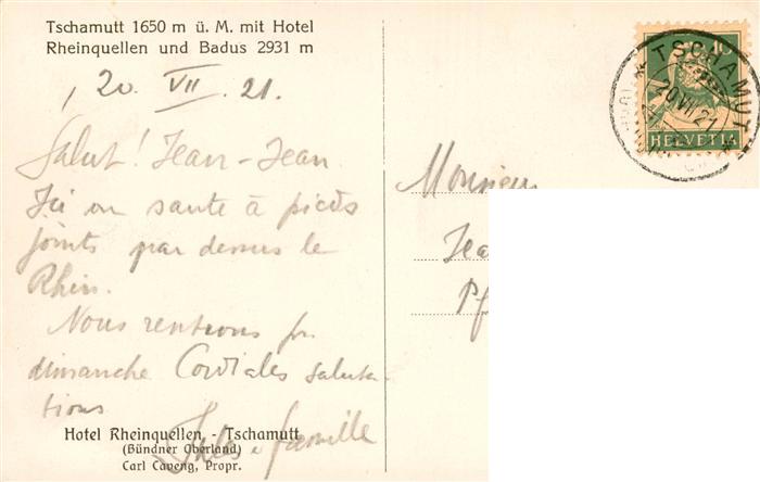 13959266 alte Postkarte Tschamutt GR Ansicht mit Hotel Rheinquellen und Badus postalisch gelaufen Erhaltung siehe scans [FriedD77] KatCode: 11470100355538