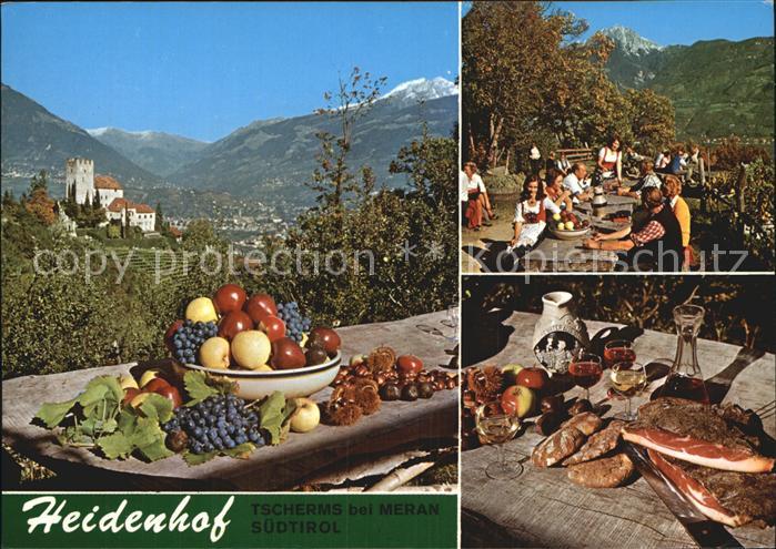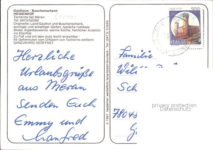 old postcard Tscherms Gasthaus Heidenhof postalisch gelaufen Erhaltung siehe scans