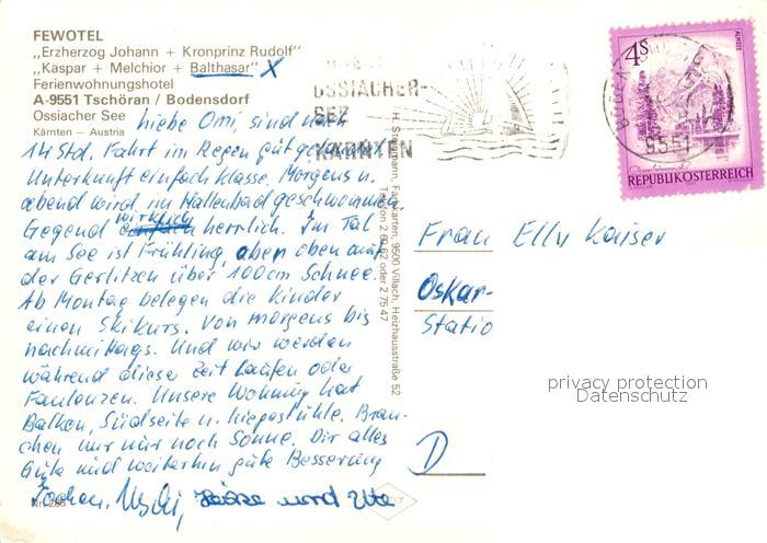 73304354 alte Postkarte Tschoeran Bodensdorf Ferienwohnungshotel Fliegeraufnahme postalisch gelaufen Erhaltung siehe scans [FriedD77] KatCode: 11390