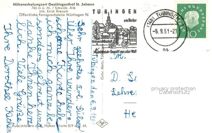 73644133 TueBINGEN BW Aussichtsturm auf der Hohen Warte Gestuetsgasthof St. Johann Schwaebische Alb postalisch gelaufen Erhaltung siehe scans [FriedD77] alte Postkarte Frie Katcode 11110008416041