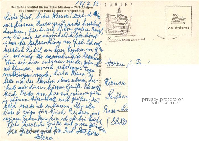 73756334 TueBINGEN BW Deutsches Institut f. aerztliche Mission Tropenheim Paul Lechler-Krankenhaus postalisch gelaufen Erhaltung siehe scans [LiesaD40] alte Postkarte Lies Katcode 11110008416041