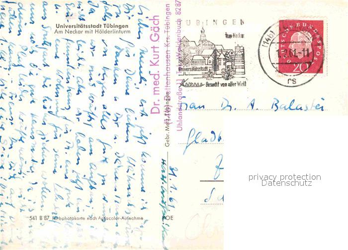 72692305 alte Postkarte TueBINGEN BW Partie am Neckar mit Hoelderlinturm Universitaetsstadt postalisch gelaufen Erhaltung siehe scans [FriedD77] KatCode: 11110008416041