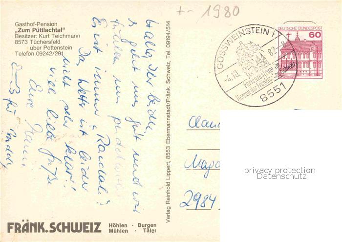 72912013 alte Postkarte Tuechersfeld Gasthof Zum Puettlachtal postalisch gelaufen Erhaltung siehe scans [NatalD47] KatCode: 11110009472179