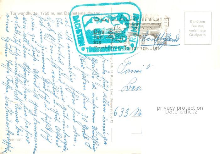 73591775 alte Postkarte Tuerlwandhuette Berghaus mit Dachsteinsuedwand postalisch gelaufen Erhaltung siehe scans [FriedD77] KatCode: 11390222061236