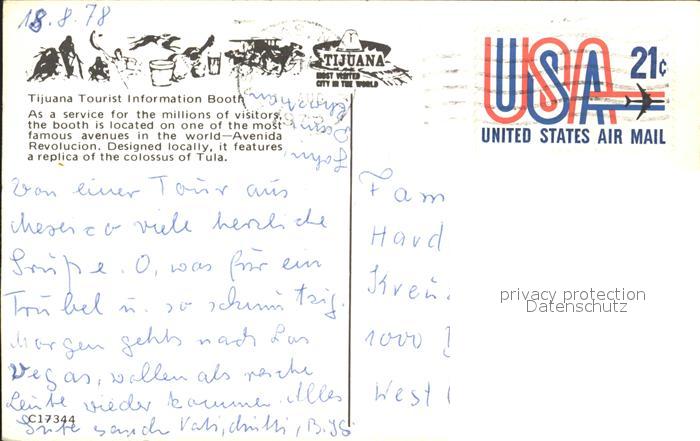 old postcard Tula Hidalgo Tijuana Tourist Information Booth Avenida Revolucion postalisch gelaufen Erhaltung siehe scans