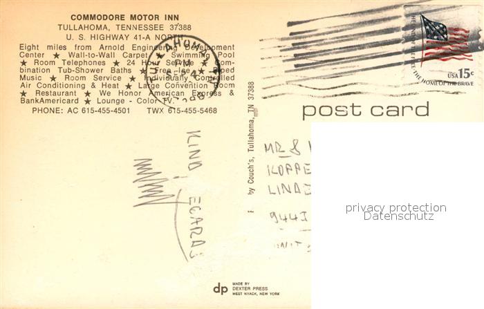 73333573 old postcard Tullahoma Commodore Motor Inn postalisch gelaufen Erhaltung siehe scans [FriedD77] KatCode: 14140450000000
