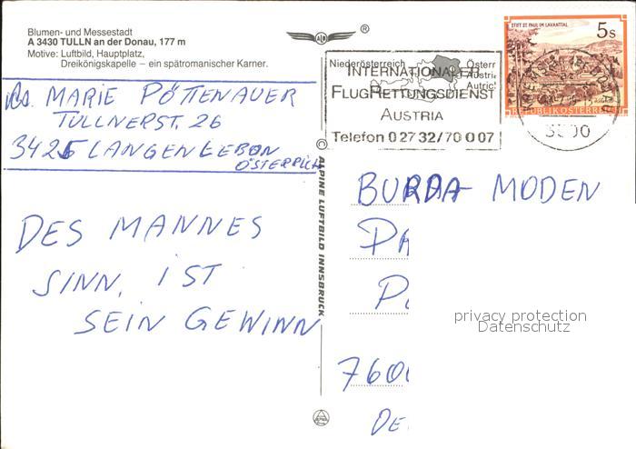 72437560 alte Postkarte Tulln Donau Hauptplatz Dreikoenigskapelle postalisch gelaufen Erhaltung siehe scans KatCode: 11390126032135