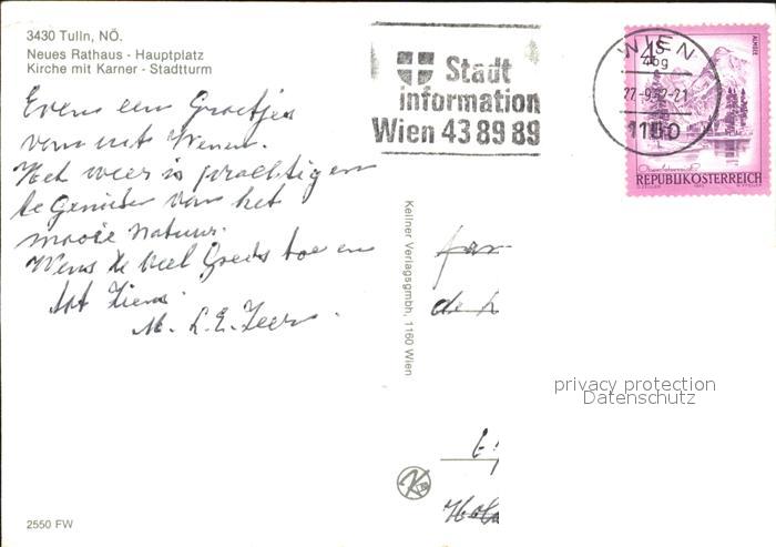72597670 alte Postkarte Tulln Donau Rathaus Hauptplatz Kirche mit Karner postalisch gelaufen Erhaltung siehe scans [LiesaD40] KatCode: 11390126032135