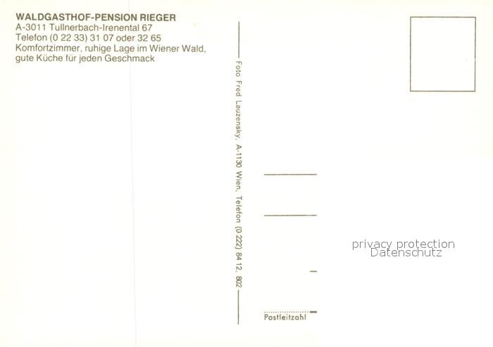 73264648 Tullnerbach Waldgasthof Pension Rieger postalisch nicht gelaufen Erhaltung siehe scans [KathaD81] KatCode: 11390126032421