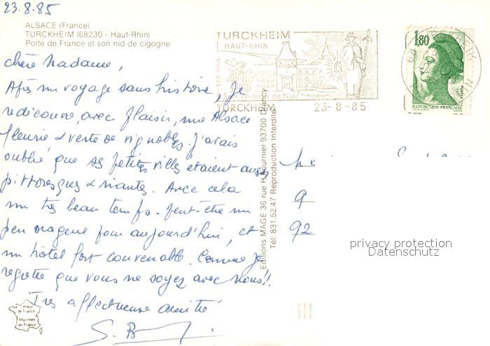 carte postale Turckheim Haut Rhin Porte de France et son nid de cigogne postalisch gelaufen Erhaltung siehe scans [FriedD77]