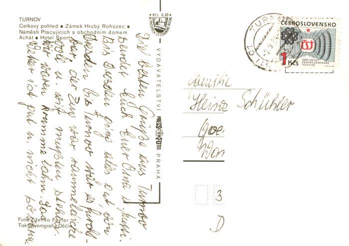 old postcard Turnov Turnau CZ Panorama Zamek Hruby Rohozec Namesti Pracujicich s obcheodnim domem Achat Hotel Sport postalisch gelaufen Erhaltung siehe scans [WerneD78]
