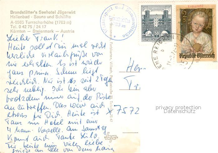 73629053 alte Postkarte Turracher Hoehe Brandstaetters Seehotel Jaegerwirt Hallenbad Sauna postalisch gelaufen Erhaltung siehe scans [WerneD78] KatCode: 11390213020508