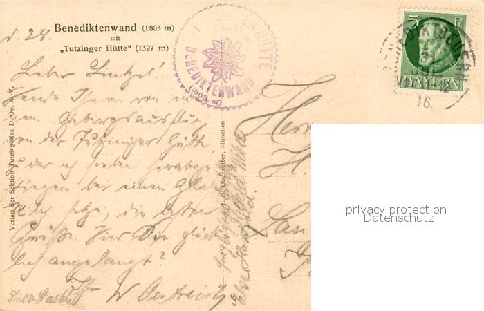 73807302 alte Postkarte Tutzingerhuette 1327m Benediktinerwand Benedictenwand postalisch gelaufen Erhaltung siehe scans [FriedD77] KatCode: 11110009188141