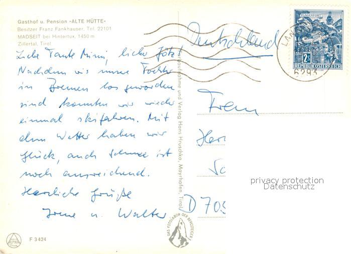 73158066 alte Postkarte Tux Gasthof Pension Alte Huette Wintersportplatz Zillertaler Alpen postalisch gelaufen Erhaltung siehe scans [FriedD77] KatCode: 11390335070934
