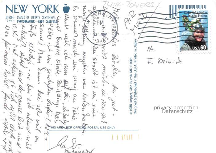 74095747 old postcard Twin Towers New York USA The Statue of Liberty postalisch gelaufen Erhaltung siehe scans [SanaeD93] KatCode: 14140340000000