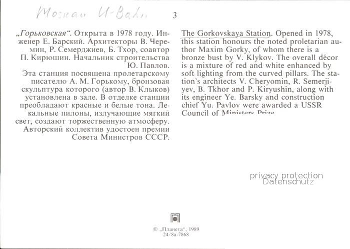 U-Bahn Subway Underground Metro Moskau Gorkovskaya Station postalisch nicht gelaufen Keine Postkarte (siehe scan) Erhaltung siehe scans