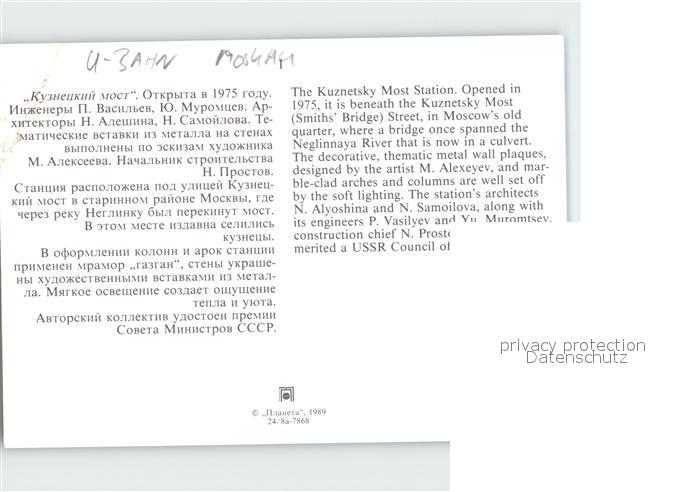 U-Bahn Subway Underground Moskau Kuznetsky Most postalisch nicht gelaufen Erhaltung siehe scans