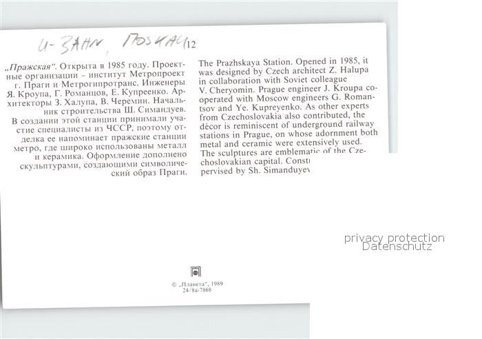 U-Bahn Subway Underground Moskau Prazhskaya postalisch nicht gelaufen Erhaltung siehe scans