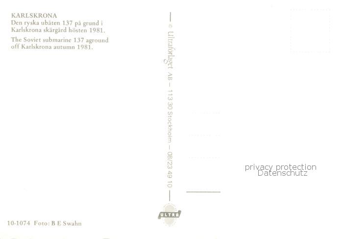 73900991 U-Boot Unterseeboot Submarine Sous-Marin Karlskrona postalisch nicht gelaufen Erhaltung siehe scans [IrynaD87] KatCode: 22480000001300