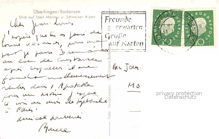 72724575 alte Postkarte ueberlingen Bodensee Blick auf die Insel Mainau und die Schweizer Alpen postalisch gelaufen Erhaltung siehe scans [WerneD78] KatCode: 11110008435059