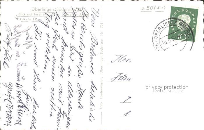 72317833 alte Postkarte ueberlingen Bodensee Blick zur Insel Mainau mit Schweizer Alpen postalisch gelaufen Erhaltung siehe scans KatCode: 11110008435059