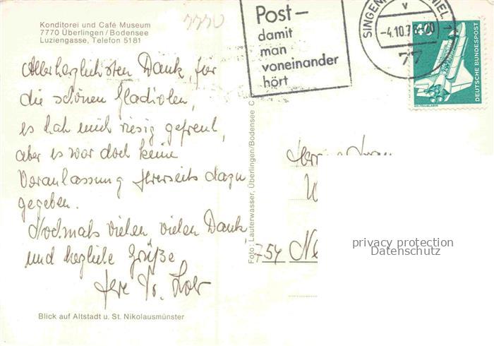ueberlingen Bodensee BW Konditorei und Café Museum Altstadt Blick zum Muenster postalisch gelaufen Erhaltung siehe scans [FriedD77] alte Postkarte Frie Katcode 11110008435059