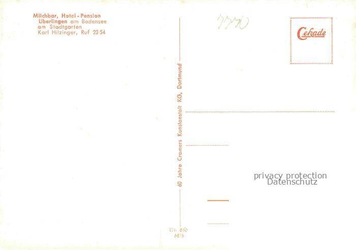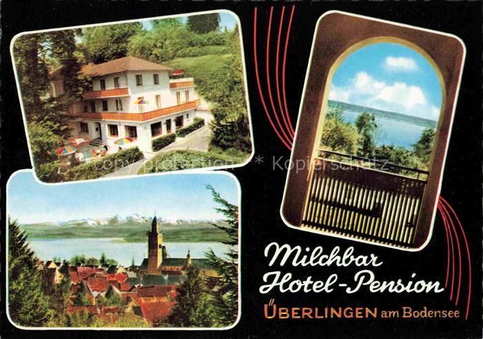 ueberlingen Bodensee BW Milchbar Hotel Pension Ortsansicht mit Kirche Alpenblick postalisch nicht gelaufen Erhaltung siehe scans [FriedD77] Frie Katcode 11110008435059