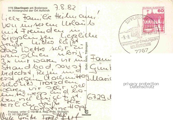74104090 alte Postkarte ueberlingen Bodensee BW Panorama im Hintergrund der Ort Aufkirch postalisch gelaufen Fliegeraufnahme Erhaltung siehe scans [FriedD77] KatCode: 11110008435059