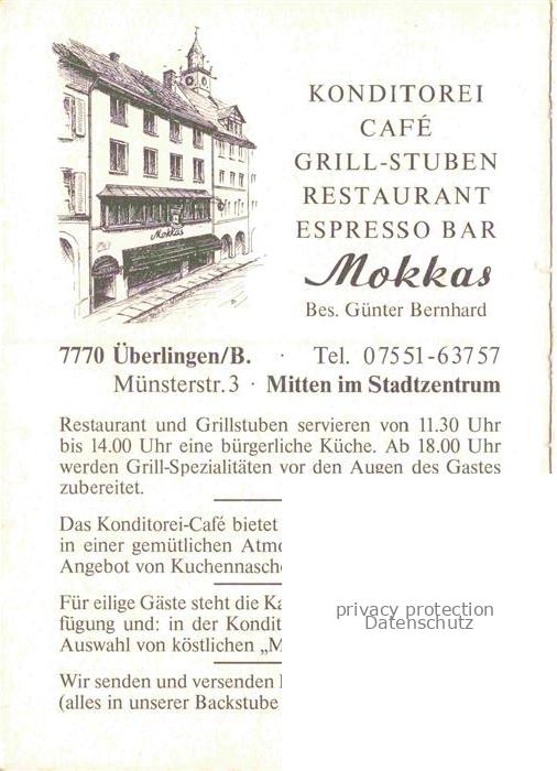 74104065 ueberlingen Bodensee BW Restaurant Mokkas Konditorei Café Verkaufstheke postalisch nicht gelaufen Werbekarte (keine Postkarte) Erhaltung siehe scans [FriedD77] Werbekarte (keine Postkarte) Frie Katcode 11110008435059