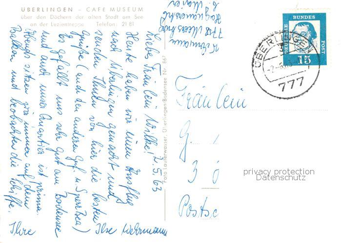 73817090 alte Postkarte ueberlingen Bodensee Cafe Museum Terrasse Blick ueber die Altstadt mit Kirche postalisch gelaufen Erhaltung siehe scans [FriedD77] KatCode: 11110008435059