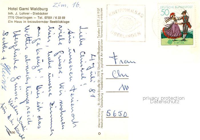 73845996 alte Postkarte ueberlingen Bodensee Hotel Garni Waldburg Gastraeume Panorama postalisch gelaufen Erhaltung siehe scans [FriedD77] KatCode: 11110008435059