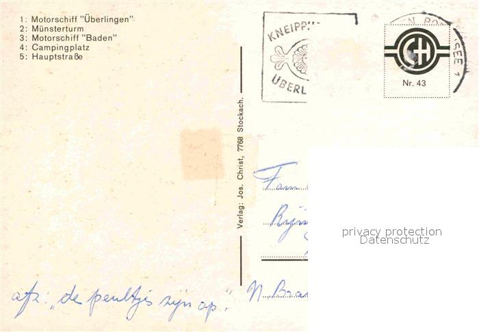 72885804 alte Postkarte ueberlingen Bodensee Motorschiff Muensterturm Campingplatz Hauptstrasse Sonnenuntergang Segelboot postalisch gelaufen Erhaltung siehe scans [FriedD77] KatCode: 11110008435059