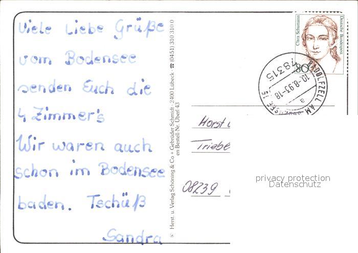 72367095 alte Postkarte ueberlingen Bodensee Teilansichten Strassencafe Uferpromenade Turm Faehre postalisch gelaufen Erhaltung siehe scans KatCode: 11110008435059