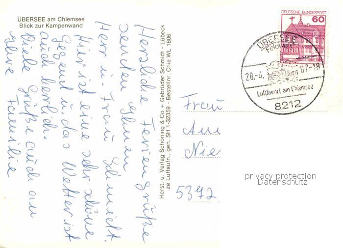 72919688 alte Postkarte uebersee Panorama Blick zur Kampenwand Chiemgauer Alpen Fliegeraufnahme postalisch gelaufen Erhaltung siehe scans [FriedD77] KatCode: 11110009189159