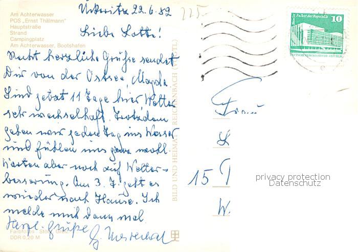 73863641 alte Postkarte ueckeritz Ueckeritz Usedom Am Achterwasser POS Ernst Thaelmann Hauptstrasse Strand Campingplatz Bootshafen postalisch gelaufen Erhaltung siehe scans [WerneD78] KatCode: 11110013059096