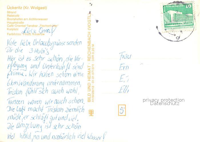 73082862 alte Postkarte ueckeritz Usedom Strand Ratscafe Bootshafen Achterwasser Hauptstrasse Cafe Kurplatz postalisch gelaufen Erhaltung siehe scans [FriedD77] KatCode: 11110013059096