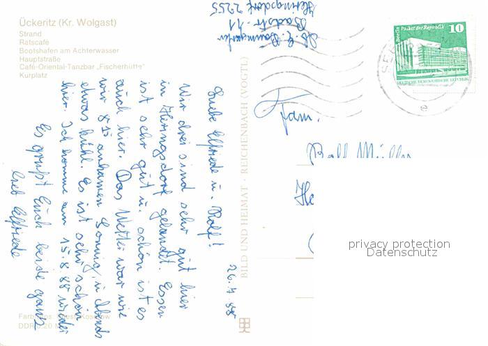 72625784 alte Postkarte ueckeritz Usedom Strand Ratscafe Bootshafen Achterwasser Hauptstrasse Cafe Oriental Tanzbar Fischerhuette Kurplatz postalisch gelaufen Erhaltung siehe scans [FriedD77] KatCode: 11110013059096