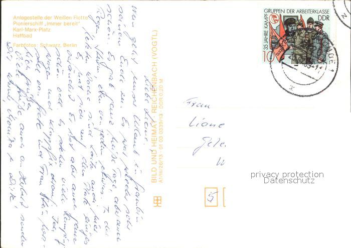 72248538 alte Postkarte Ueckermuende Mecklenburg Vorpommern Anlegestelle Weisse Flotte Pionierschiff Immer bereit Karl Marx Platz Haffbad postalisch gelaufen Erhaltung siehe scans KatCode: 11110013062059