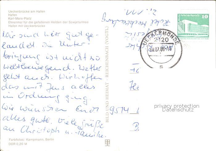 alte Postkarte Ueckermuende Mecklenburg Vorpommern Hafen Karl-Marx-Platz Ehrenmal postalisch gelaufen Erhaltung siehe scans