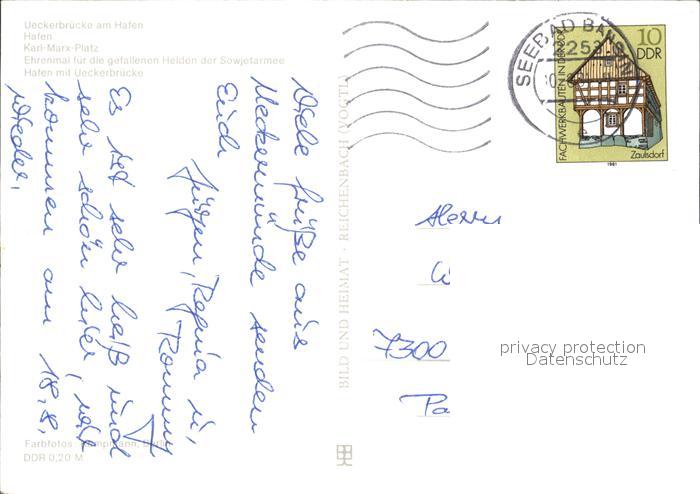 72124889 alte Postkarte Ueckermuende Mecklenburg Vorpommern Hafen Karl-Marx-Platz Ehrenmal postalisch gelaufen Erhaltung siehe scans KatCode: 11110013062059