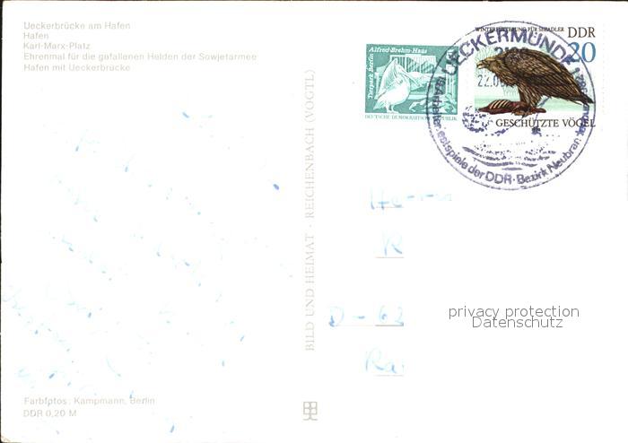72550401 alte Postkarte Ueckermuende Mecklenburg Vorpommern Hafen Karl Marx Platz Ehrenmal Sowjetarmee Ueckerbruecke postalisch gelaufen Erhaltung siehe scans [KathaD79] KatCode: 11110013062059