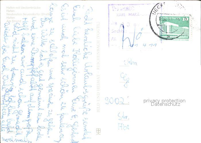 72373450 alte Postkarte Ueckermuende Mecklenburg Vorpommern Hafen Neubauten Neuendorfer Strasse Strand postalisch gelaufen Erhaltung siehe scans KatCode: 11110013062059